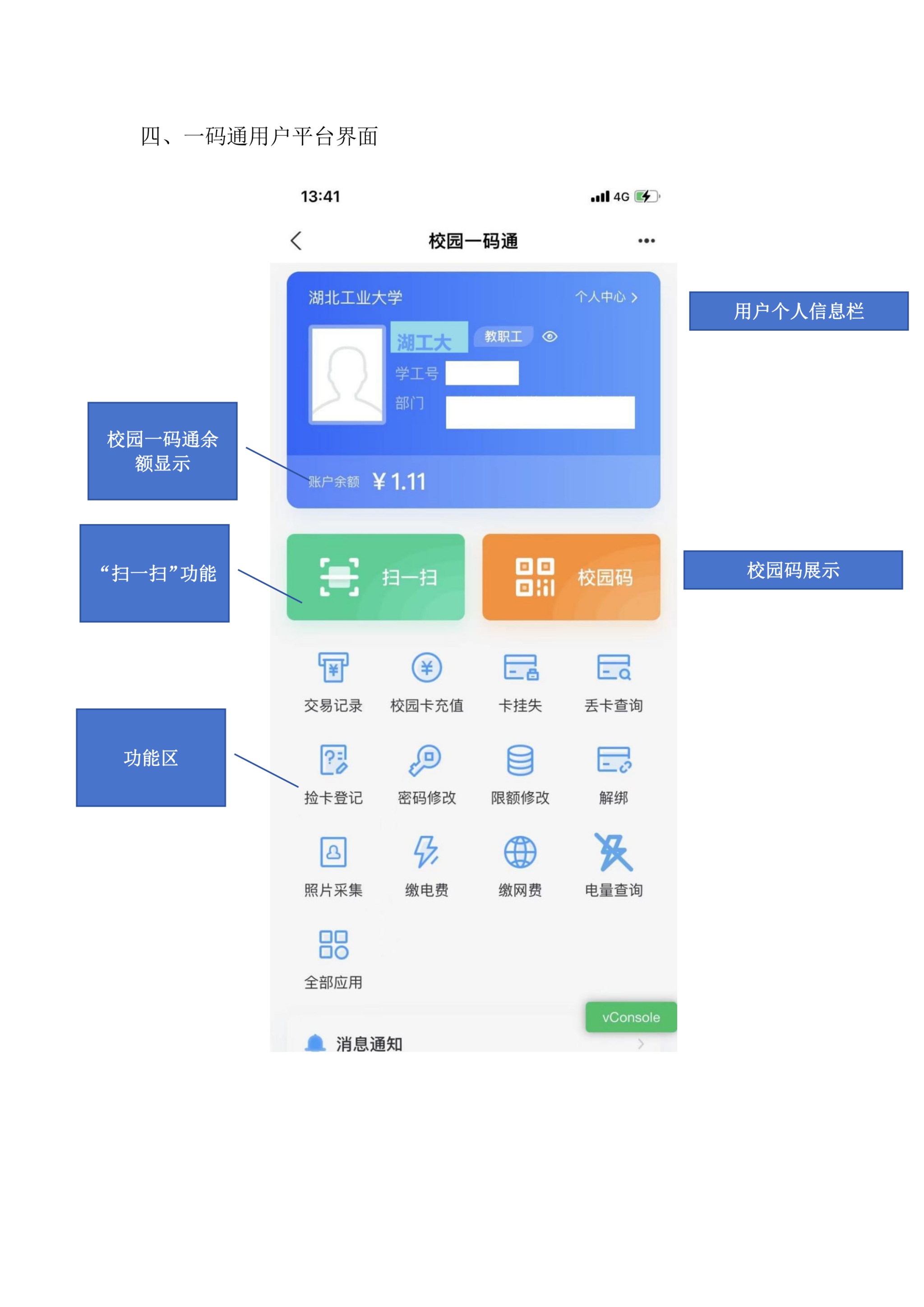 3、自助服务:通过“i湖工”公众号-->校园应用-->一码通-->用户帮助,进行在线咨询和故障报修。