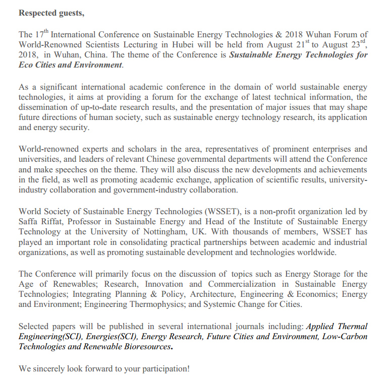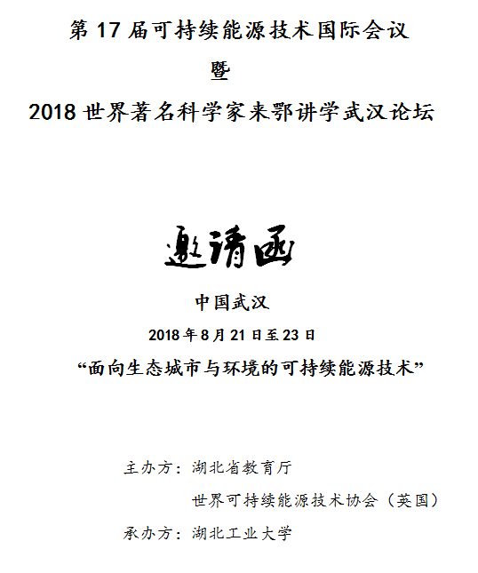 “第17届可持续能源技术国际会议暨2018世界著名科学家来鄂讲学武汉论坛”将于2018年8月21日至8月23日在湖北武汉举行。大会主题为:“面向生态城市与环境的可持续能源技术”。