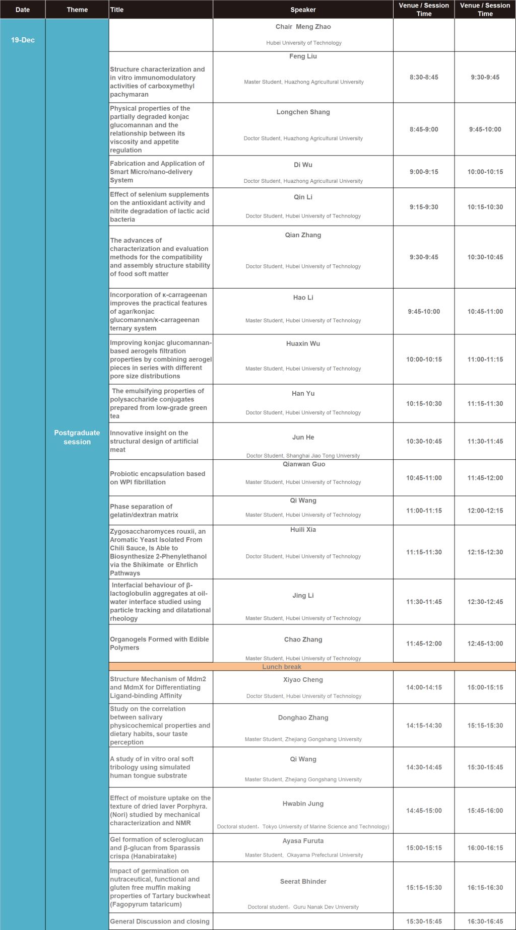 会议主题包括:食品胶体未来趋势、质构/感官、吞咽障碍、凝胶的基本原理和应用、扩散和释放、乳液稳定的微观机理、谷物产品的发展等,每个领域的专家将讨论最新研究动态,为了促进食品胶体未来发展,特在19号开设研究生专场。由于Covid-19的影响,会议将通过腾讯会议形式进行,期待您的加入!