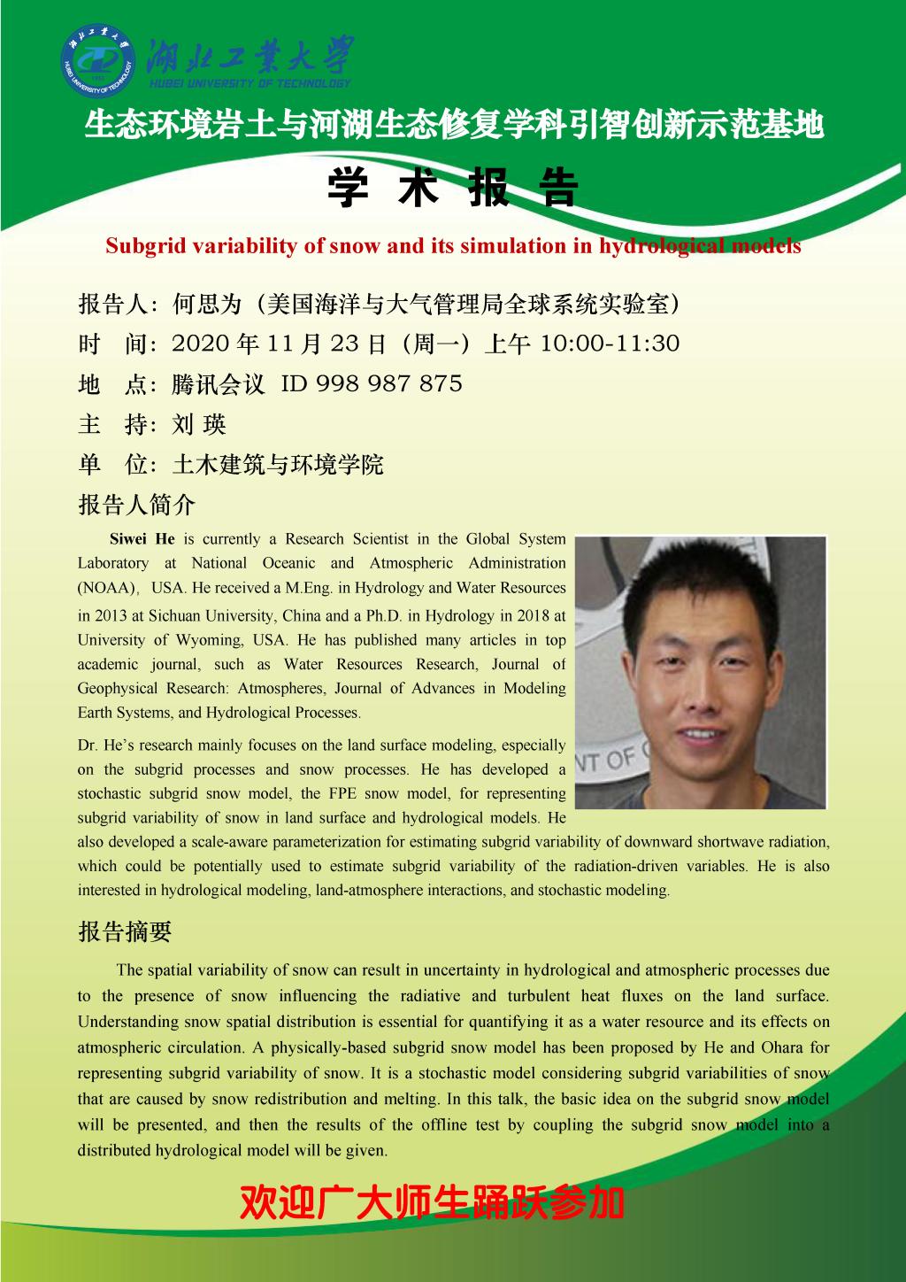 Siwei He is currently a Research Scientist in the Global System Laboratory at National Oceanic and Atmospheric Administration (NOAA),USA. He received a M.Eng. in Hydrology and Water Resources in 2013 at Sichuan University, China and a Ph.D. in Hydrology in 2018 at University of Wyoming, USA. He has published many articles in top academic journal, such as Water Resources Research, Journal of Geophysical Research: Atmospheres, Journal of Advances in Modeling Earth Systems, and Hydrological Processes.
