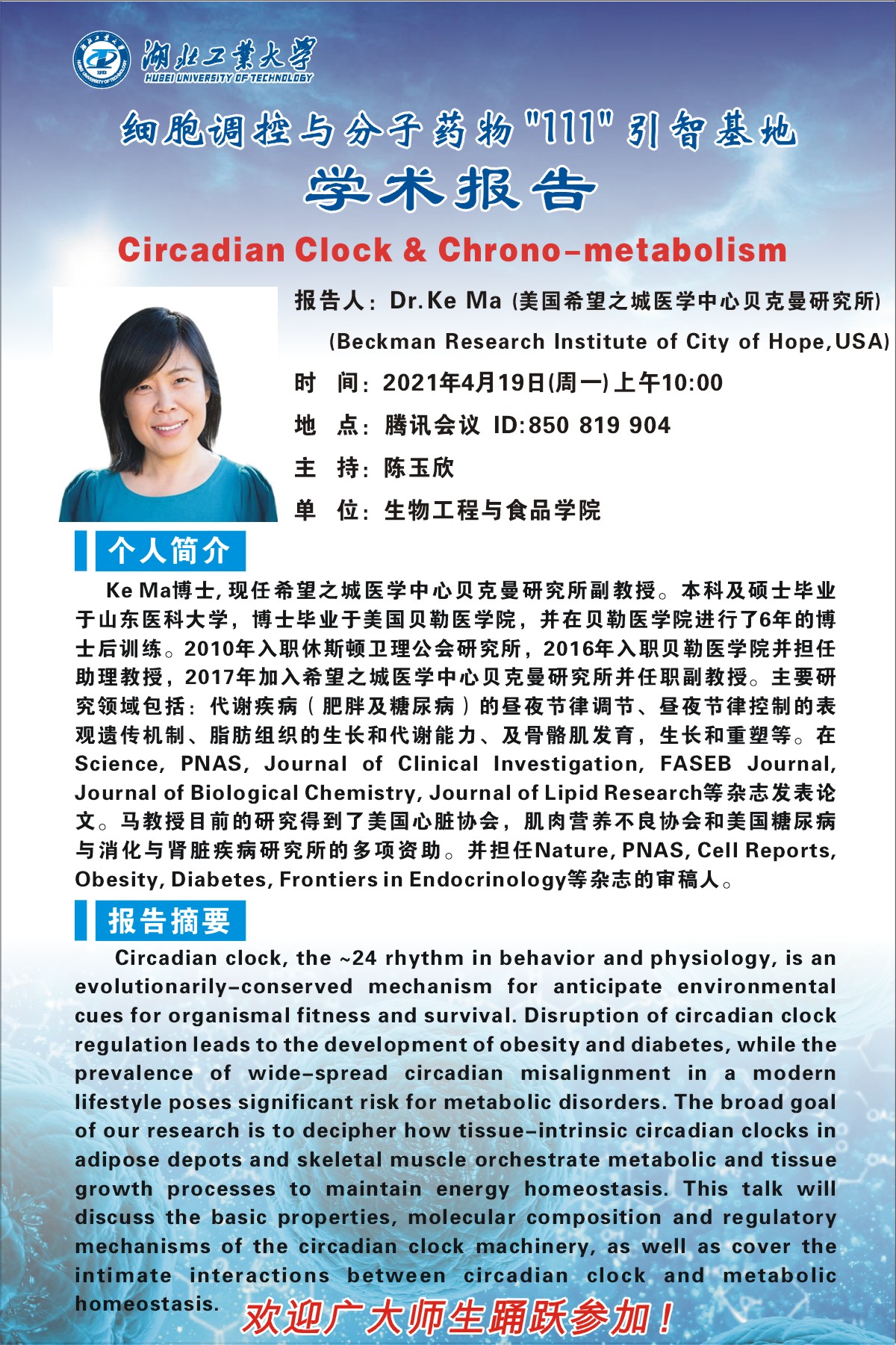 报告人:Dr. Ke Ma(美国希望之城医学中心贝克曼研究所)(Beckman Research Institute of City of Hope, USA)