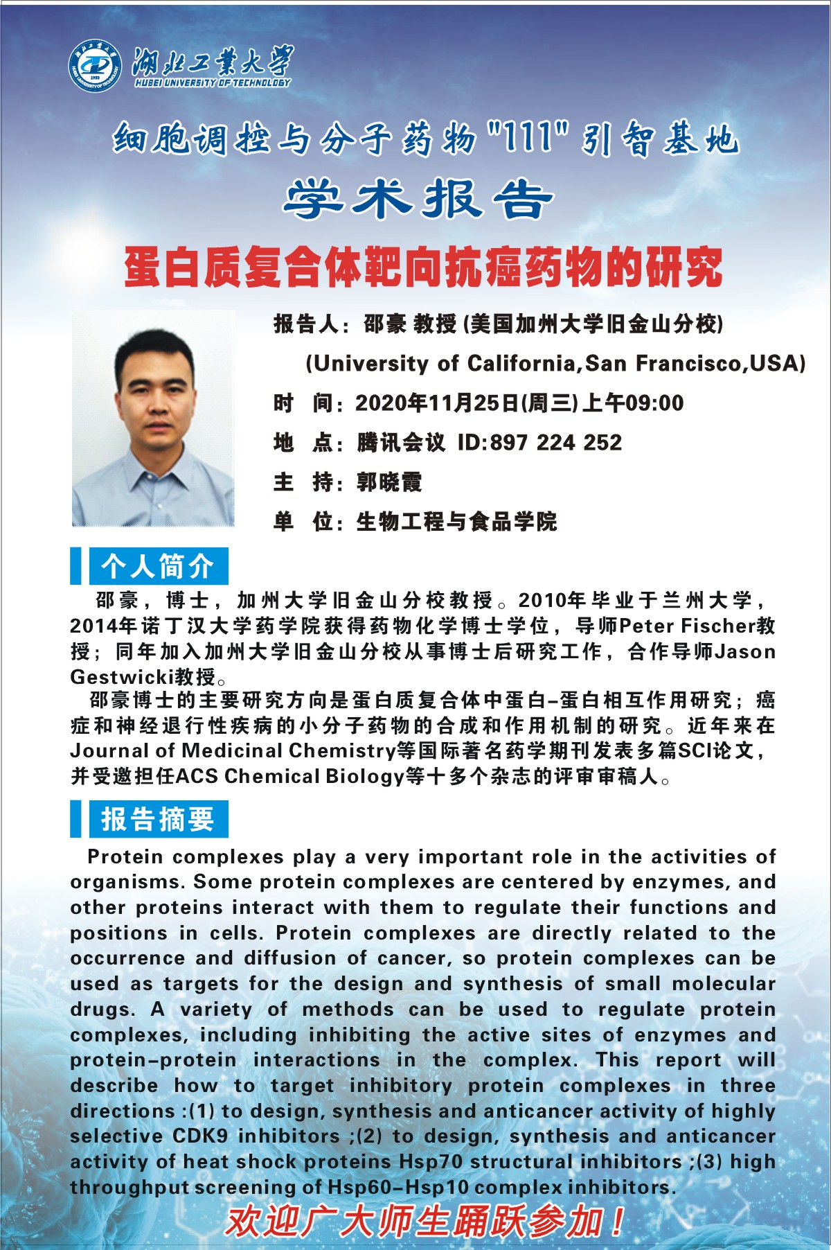报告人:邵豪 教授(美国加州大学旧金山分校)(University of California, San Francisco, Canada)