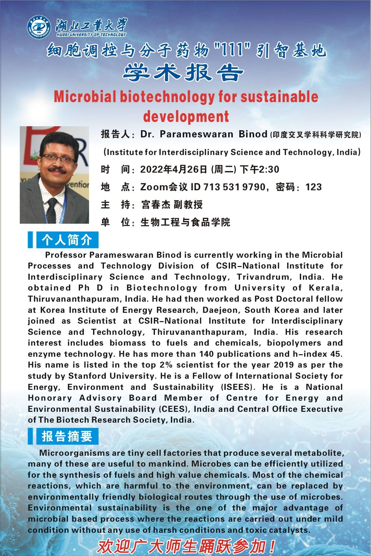 报告人:Dr. Parameswaran Binod(印度交叉学科科学研究院)(National Institute for Interdisciplinary Science and Technology, India)