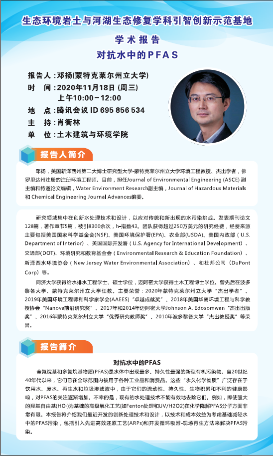报告主题:对抗水中的PFAS报告人:邓扬(蒙特克莱尔州立大学)时 间:2020年11月18日(周三)上午 10:00-12:00地 点:腾讯会议 ID 695 856 534 主 持:肖衡林单 位:土木建筑与环境学院