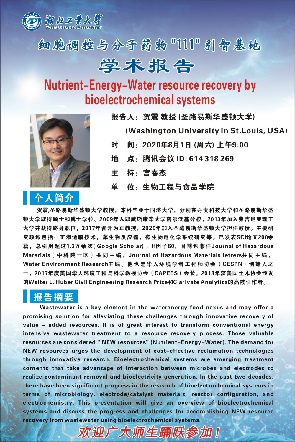 报告人:贺震 教授 圣路易斯华盛顿大学(Washington University in St. Louis, USA)