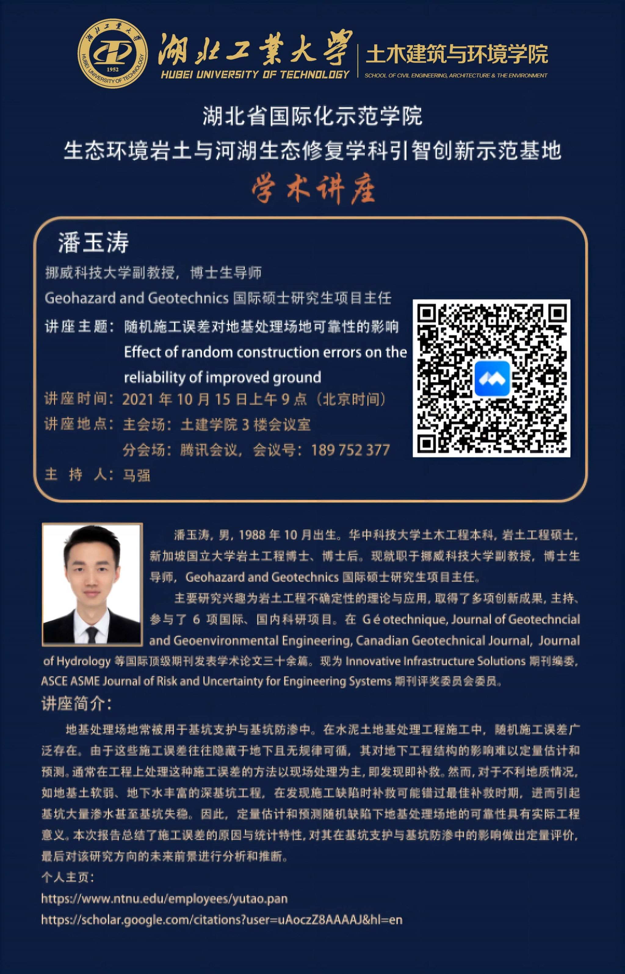 主讲人:潘玉涛,挪威科技大学副教授,博士生导师,Geohazard and Geotechnics国际硕士研究生项目主任