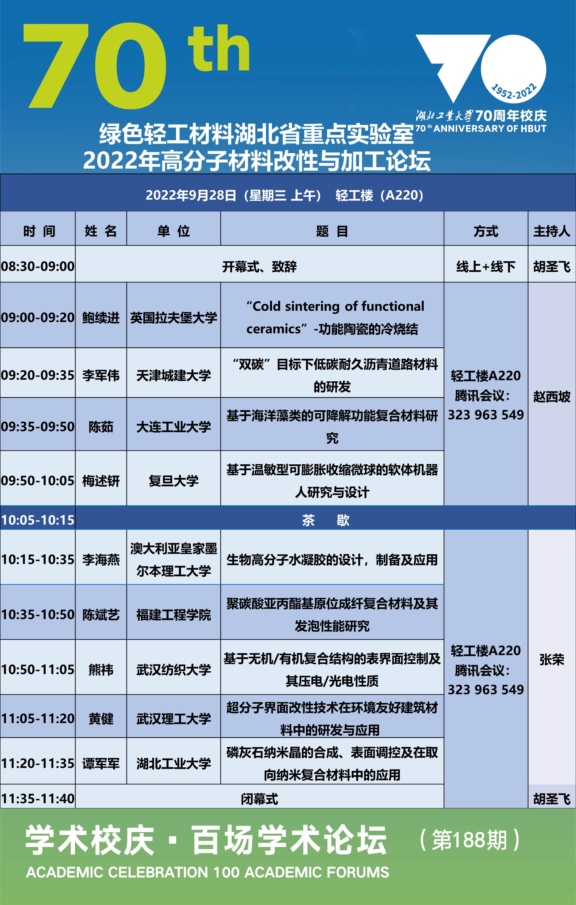学术校庆·百场学术论坛——绿色轻工材料湖北重点实验室2022年高分子材料改性与加工论坛(第188期)