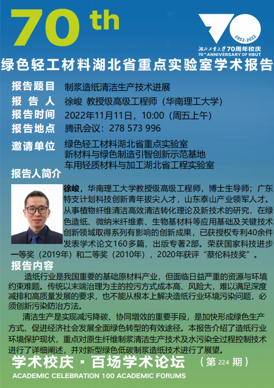 学术校庆·百场学术论坛——绿色轻工材料湖北重点实验室报告(第224期)